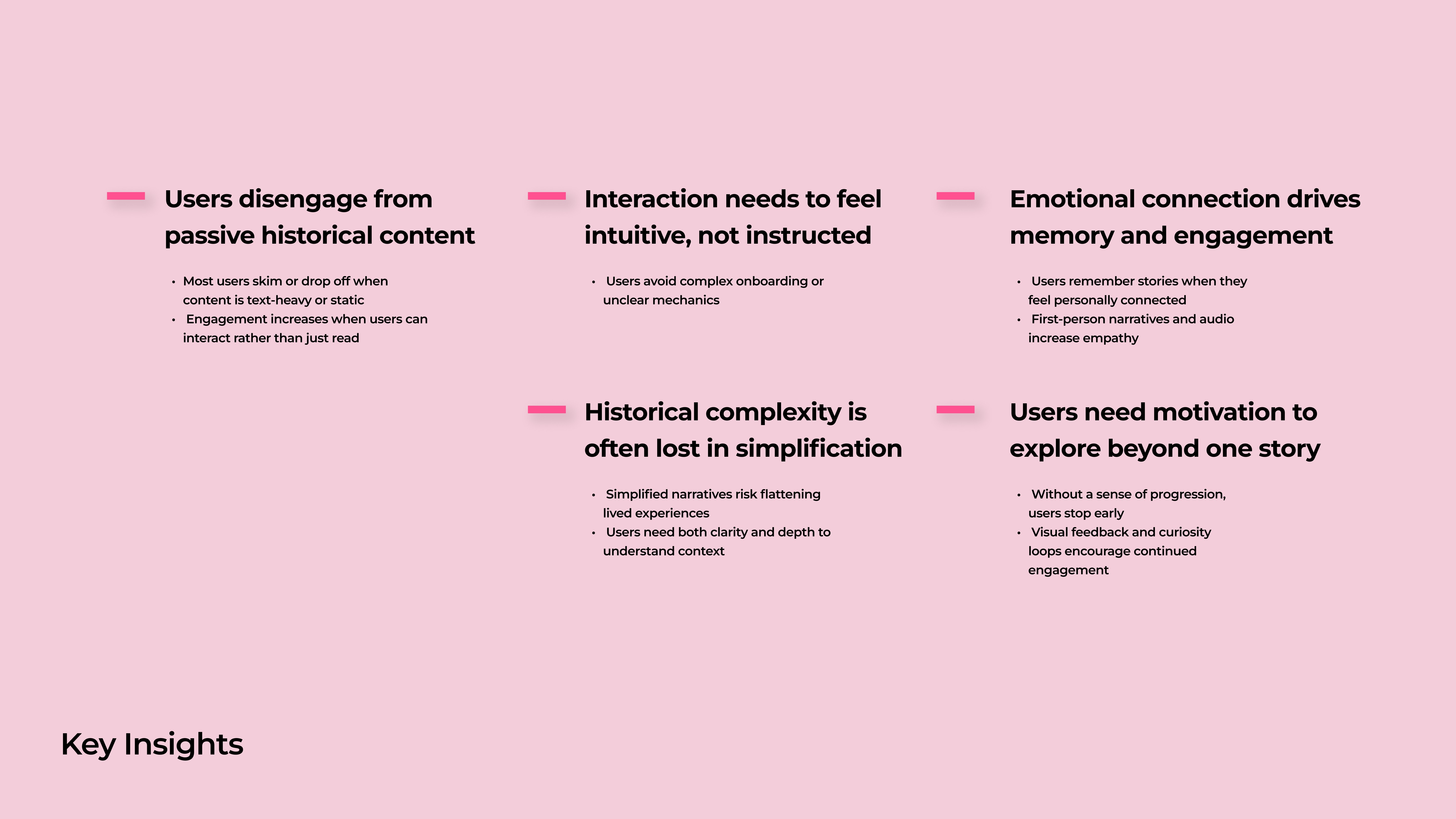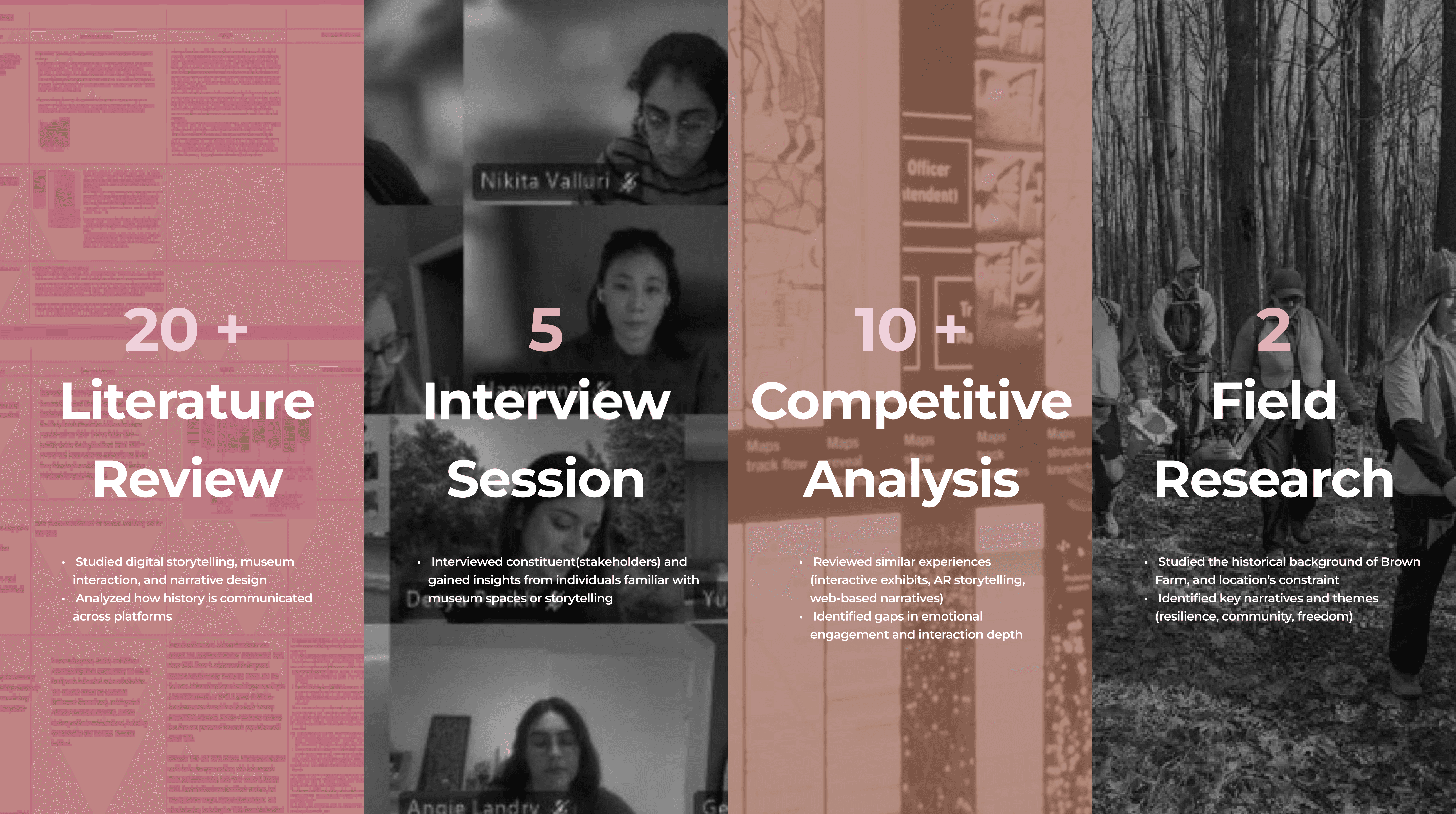 We conducted mixed-method research to understand how users engage with historical content and how storytelling can become more immersive and accessible in a digital format. Our research focused on: - User behavior in digital storytelling experiences - Existing historical and museum-based interactions - The cultural and emotional context of Brown Farm