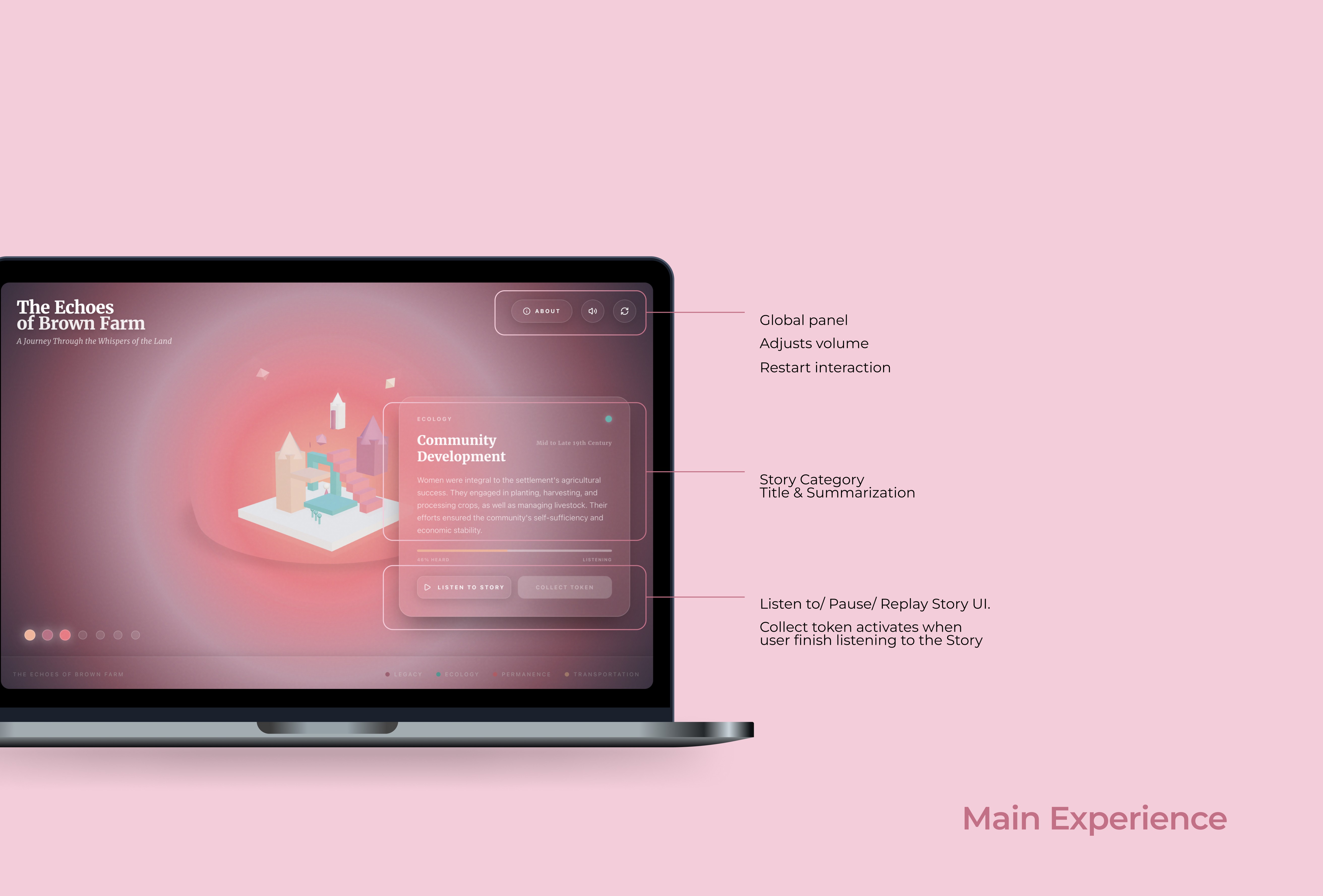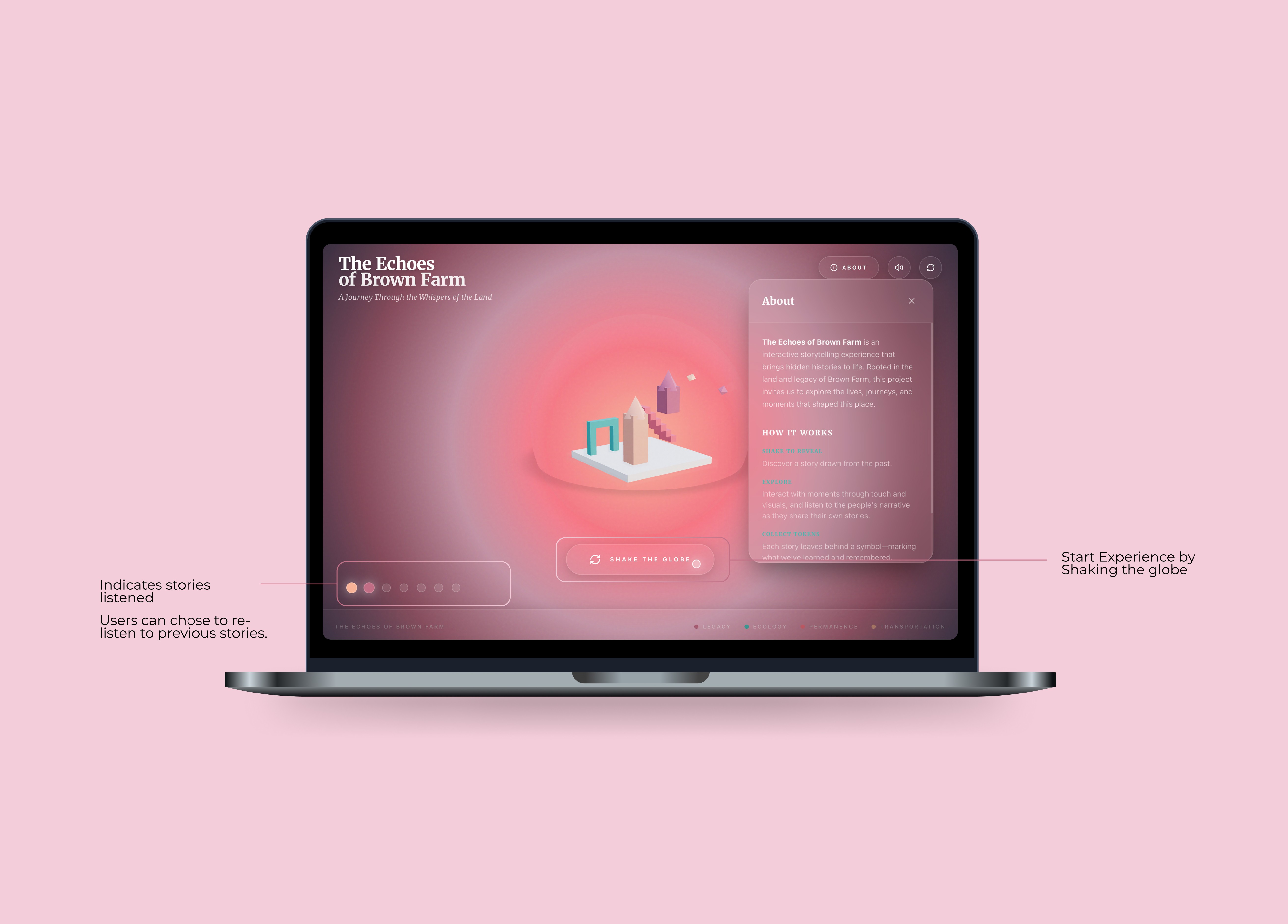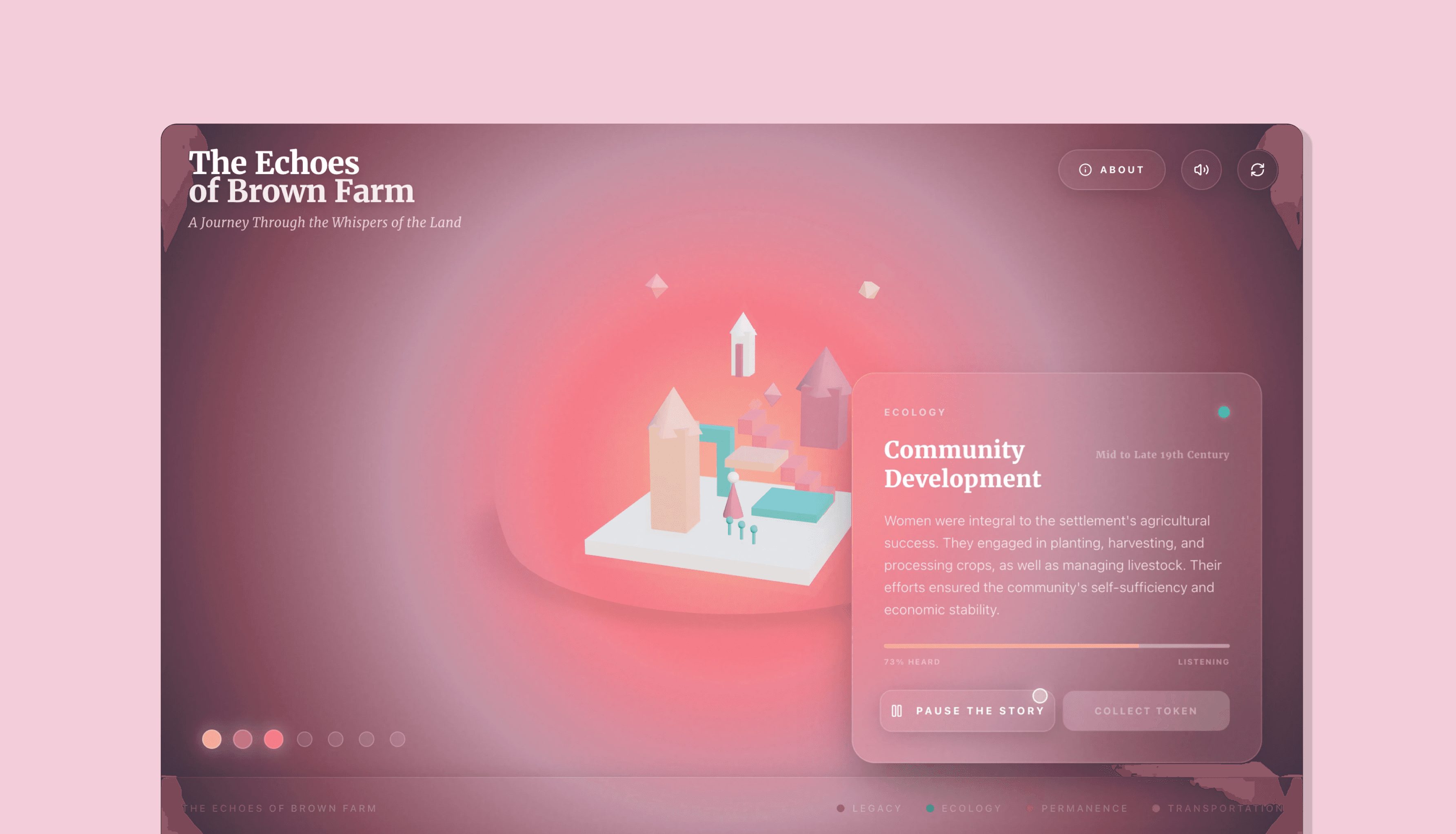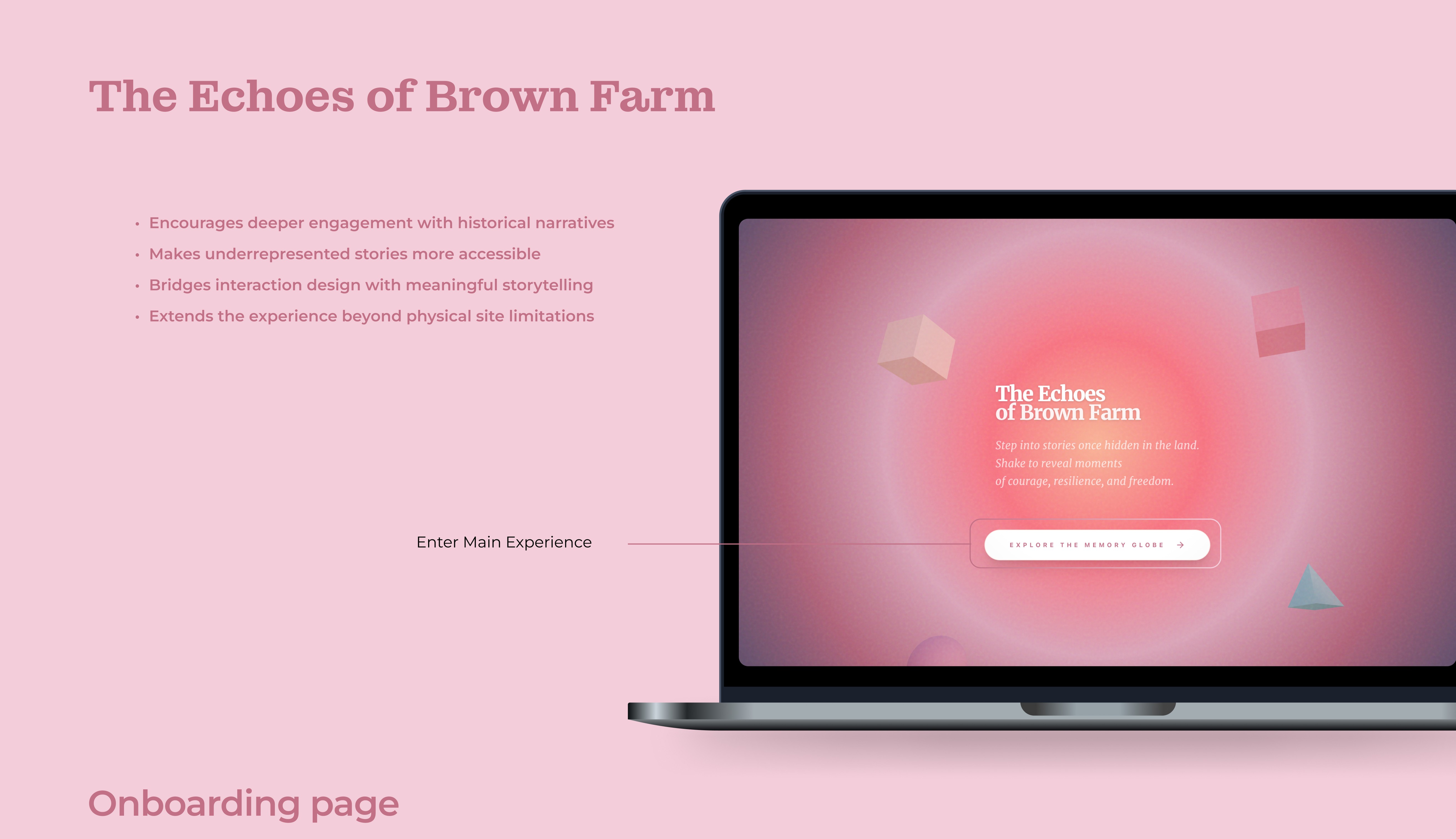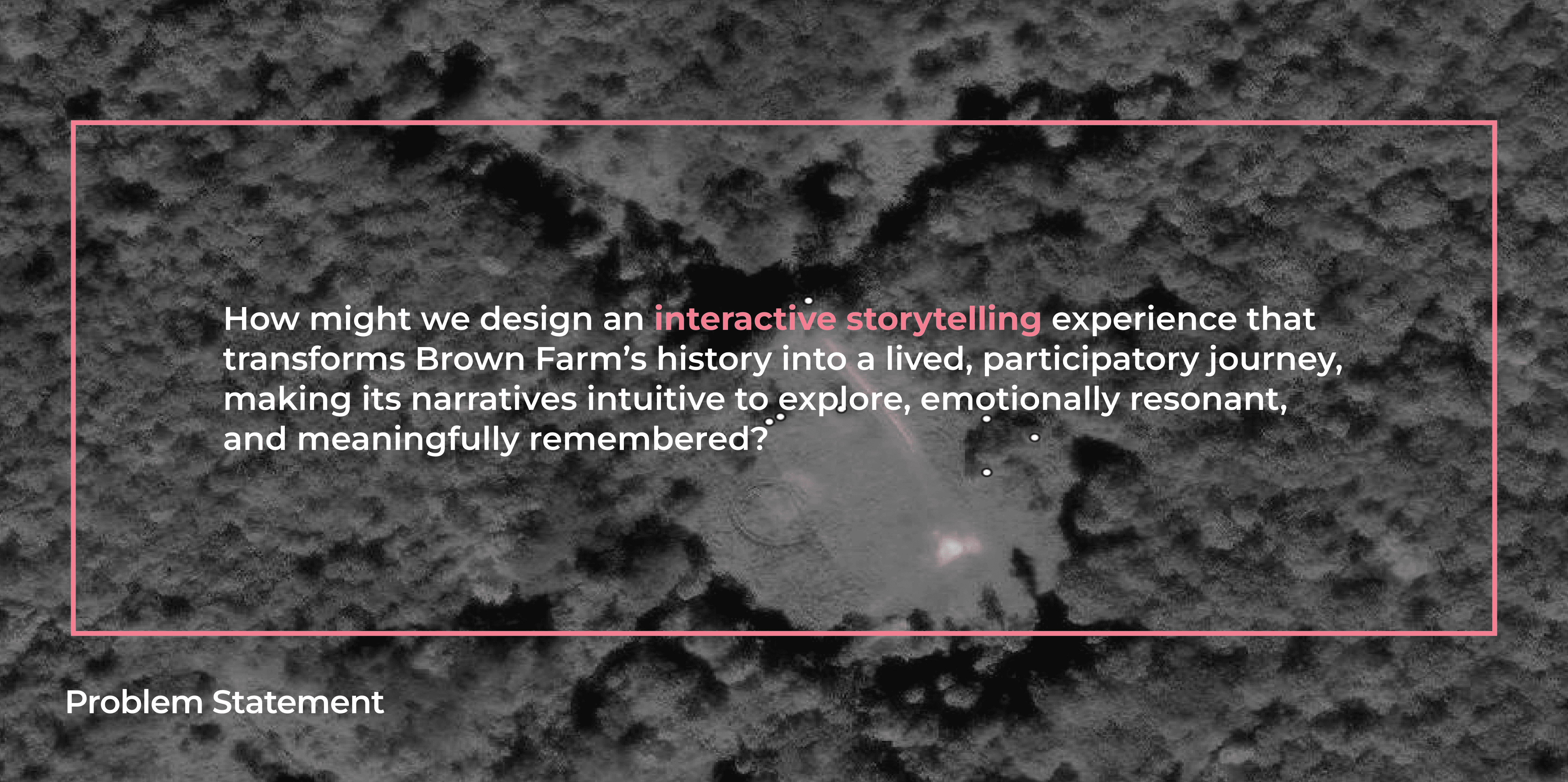 The Echoes of Brown Farm is an interactive, web-based storytelling experience that reveals the hidden histories of Brown Farm through immersive, multi-sensory narratives. Users uncover stories by engaging with a dynamic interface, each interaction reveals a personal journey rooted in resilience, survival, and community. Through a combination of visual storytelling, audio narration, and symbolic interactions, the experience transforms history from something static into something felt, explored, and remembered. This is a redesign of a team-based client project for Brown Farm. After the project deadline, I independently reimagined the experience to further explore interaction design, narrative immersion, and emotional engagement. This iteration reflects my own design decisions, focusing on refining the user experience and strengthening the storytelling.